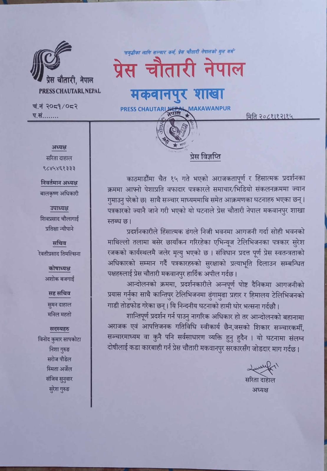मकवानपुर । चैत्र १५ गते काठमाडौको तिनकुनेमा राजावादीहरुले गरेको आन्दोलनको समाचार–फुटेज सङ्कल गर्न गएका एभी न्युजका फोटो पत्रकार सुरेश रजकको हत्याको विरोध गर्दै मकवानपुरका पत्रकार संगठनहरुले प्रेस विज्ञप्ति जारी गर्दै विरोध जनाएका छन् ।