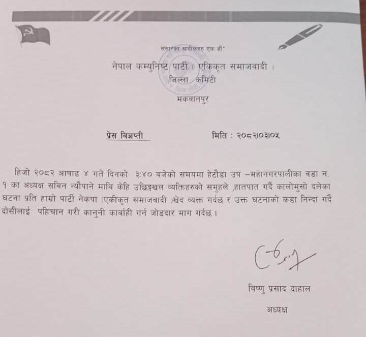 २०८२ साल असार ४ गते दिउँसो ३:४० बजेको समयमा केही उच्छृङ्खल व्यक्तिहरूको समूहले अध्यक्ष न्यौपानेमाथि हातपात गर्नुका साथै कालो मसो दलिएको घटनाले लोकतान्त्रिक मूल्य–मान्यतालाई नै चुनौती दिएको भन्दै नेकपा (एकीकृत समाजवादी) मकवानपुर जिल्ला कमिटीले कडा शब्दमा निन्दा गरेको छ।