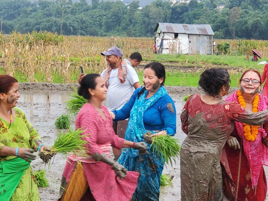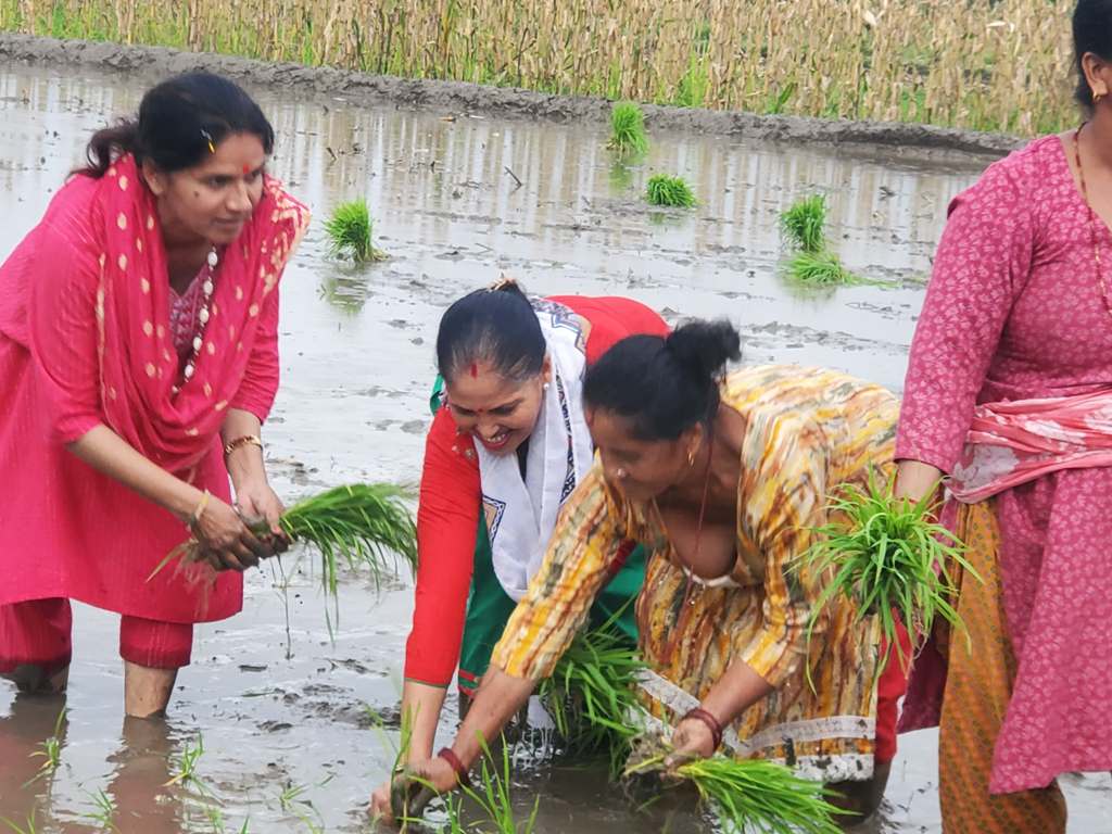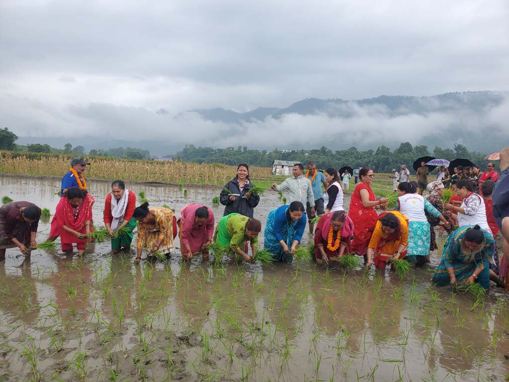 हेटौंडा । हेटौंडा उपमहानगरपालिका कि मेयर मिना कुमारी लामा, हेटौँडा ११ वडाध्यक्ष जुना दाहाल, हेटौंडा ३ का वडाध्यक्ष ढलक थापा, वडा सदस्य गोपिनी सापकोटा खेतमा धान रोपेर धान दिवस मनाइरहेका थिए । ‘‘असारे गीत धानको बाला रोपेर अहिलेलाई छोडिराखौँला धानको बाला झुलेसी आएर फेरि गोडौला’’ यस्तै–यस्तै भाका हाल्दै मेयर लगायत अरु पनि रोपाहारहरु ।