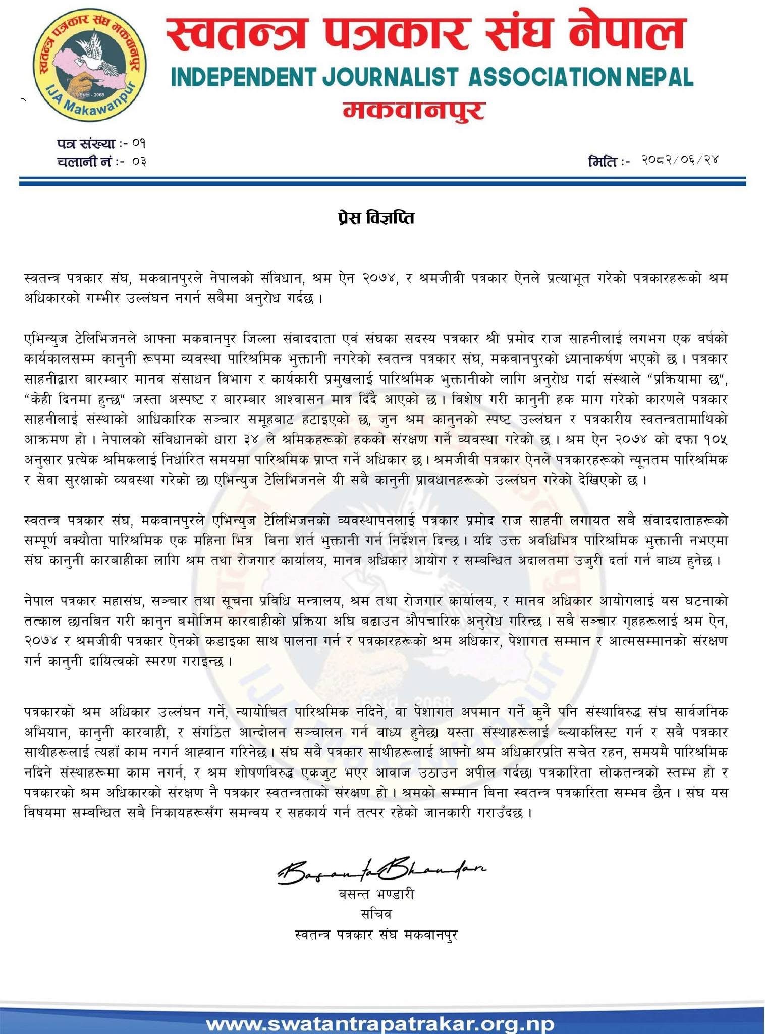 स्वतन्त्र पत्रकार संघ, मकवानपुरले एभिन्युज टेलिभिजनको व्यवस्थापनलाई पत्रकार प्रमोद राज साहनीसहित सबै संवाददाताहरूको सम्पूर्ण बक्यौता पारिश्रमिक एक महिनाभित्र बिना शर्त भुक्तानी गर्न निर्देशन दिएको छ। यदि उक्त अवधिमा पारिश्रमिक भुक्तानी नहुँदा, संघले कानुनी कारबाहीका लागि श्रम तथा रोजगार कार्यालय, मानव अधिकार आयोग र सम्बन्धित अदालतमा उजुरी दर्ता गर्ने चेतावनी दिएको छ।