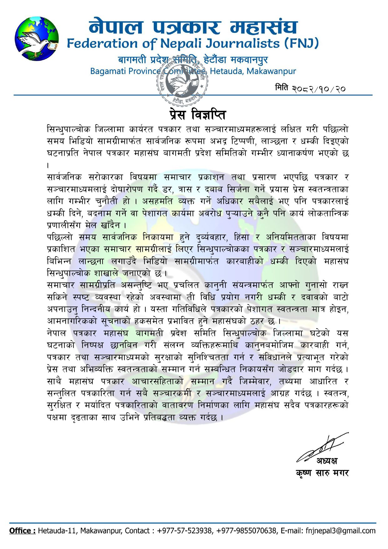 महासंघका अनुसार पछिल्लो समय सार्वजनिक निकायमा हुने दुर्व्यवहार, हिंसा र अनियमिततासम्बन्धी समाचार सामग्री प्रकाशित भएपछि त्यसप्रति असन्तुष्टि जनाउँदै सिन्धुपाल्चोकका पत्रकार तथा सञ्चारमाध्यममाथि विभिन्न लाञ्छना लगाउँदै भिडियो सामग्रीमार्फत कारबाहीको धम्की दिइएको छ। उक्त विषयमा नेपाल पत्रकार महासंघ सिन्धुपाल्चोक शाखाले जानकारी गराएको जनाइएको छ।