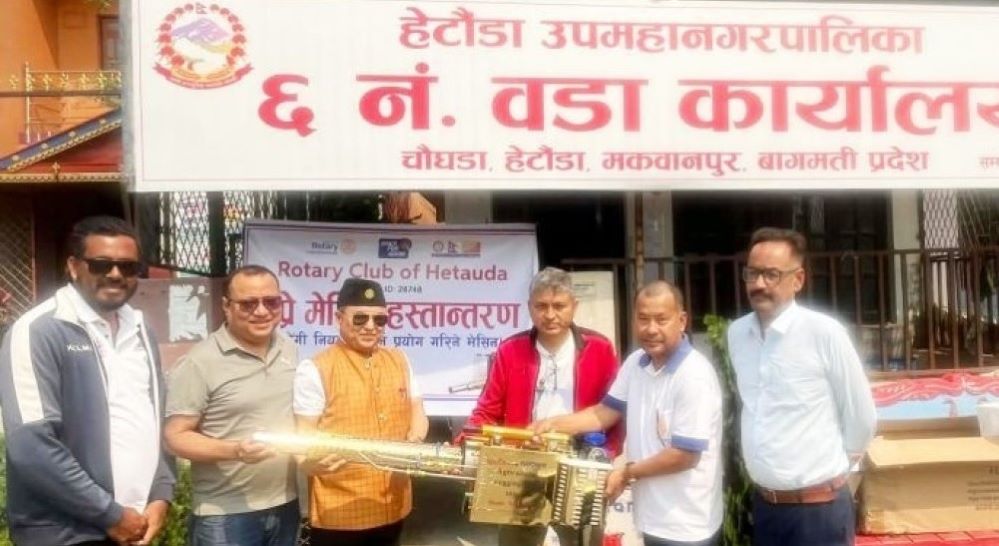 हेटौंडा । डेंगी संक्रमण बढ्दै गएपछि यसको नियन्त्रणका लागि स्थानीय तह र सामाजिक संस्थाहरू सक्रिय देखिएका छन्। यसै क्रममा रोटरी क्लब हेटौंडाले हेटौंडा उपमहानगरपालिका–६ को वडा कार्यालयलाई आवश्यक उपकरण हस्तान्तरण गरेको छ।